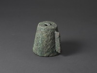 二里头文化的青铜铃都见于贵族墓,出土位置与陶寺红铜铃相似,一般也放置于墓主人的腰部或手部,多见以纺织品包裹的情况。值得注意的是,二里头遗址的铜铃往往与嵌绿松石铜牌饰共出,或与大型绿松石龙形器共出,表明这类墓的墓主人具有特殊的身份,同时也暗示着铜铃具有与祭祀礼仪相关连的功能。二里头文化的青铜铃比陶寺红铜铃更趋成熟完善,铃内顶部有一横梁,梁上悬有铃舌,使用时手捏外壁的扁鋬晃动铃身发出声音。