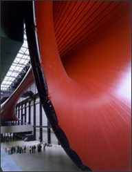 这是霍勒的一个作品(见图)。这个作品其实是一根很大的管子,像滑道一样的管子,放在这个很大的空间里面,参观者可以进入这根管子,顺着管子滑下来,去体验它带来的感受。当然,对于这种类型的艺术有很多的争论,有一些评论者认为:这怎么能称为艺术呢?这是对人身体感受的一种冲击,而不是对人视觉的冲击。所有体验过霍勒的惊险滑道的人都能够感受到,他们从中得到的感受和艺术作品本身一样,它能够把人们从2007年现在的境况,或是从日常的生活中带出来,给人一种冲击。泰特美术馆致力于展示这些作品,不仅仅是要和这些艺术家保持长期的联系,而且也是因为这些作品对我们来讲非常重要。