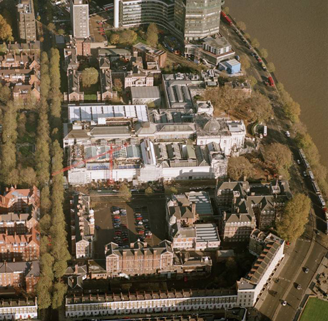 除了刚才我说的这些关于建筑外观的情况外,我还想讲讲泰特英国美术馆更多的、其他的情况。这张图是从空中鸟瞰泰特英国美术馆(见图)。大家从图片上可以看出,泰特英国美术馆的建筑是从前往后逐渐建成的。美术馆的建成耗时100年,共有50个项目在不同的时间建立,经过五六代人的建设,形成了一个混合体。