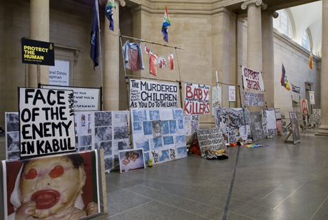 这是马克·渥林格的作品(见图),也是重新表现在伦敦其他地区发生的一些和平示威的情况,我们把这个场景搬到了美术馆。大家可以看到里面的一些内容,包括反对萨达姆、伊拉克等等。