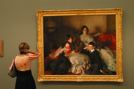 还有一个问题在泰特美术馆经常被讨论,我想其他博物馆也经常会讨论这个问题,就是:对每部作品的解释,是不是应该都写出来,是不是应该用很多的文字来解释作品,还是采取别的方式、用别的方法把信息传达给参观者。在参观作品的时候,不同的人在美术馆里的反应不一样,这里中间的一位女士正拿一个语音向导听介绍,有很多博物馆都这么做。