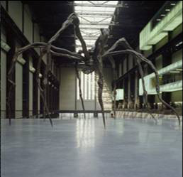 在泰特现代美术馆中,有一些非常不一样的展示,都是在刚才提到的发电机的涡轮所处的位置上做的。这是路易斯·布卢尔的作品《蜘蛛》,是用青铜制作的一只很大的蜘蛛。