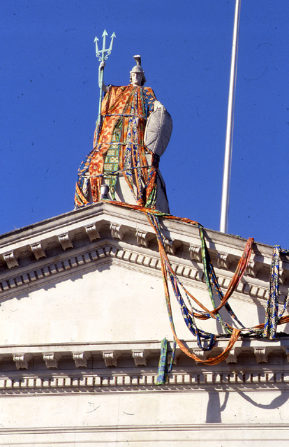 这幅图是另外一名艺术家Yinka Shonibare的作品(见图)。这个艺术家把波里塔尼亚雕塑重新包装,挂上新的衣服,这是赋予旧形式的一种新的改变。