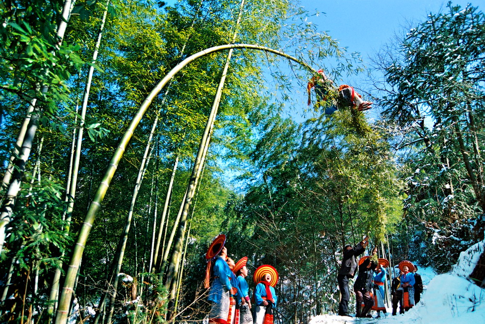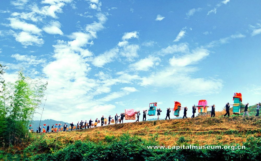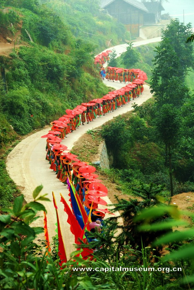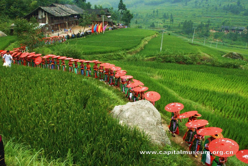 妹子要嫁人了,哪怕家里再穷,寨子里的人们都会像过盛大节日一般,个个涌动着浓烈的情怀,用他们特有的方式迎送新人,以为自己的寨子添丁添福。婚俗的突出特点是一来是上门提亲说媒的大多是些能言善道、知识广博而受人尊重的汉子,人称“媒人公”,媒人公的重要标记是手拿一把不打开的红油纸伞。二是宾客大多不太在意和理会新郎与新娘。新郎只管帮做家事,或同样挑着礼担随意夹行在送礼、迎亲的队伍中。三是新婚之夜新娘不得入洞房,而要在堂屋里独坐冷板凳,不吃不喝,静静地捱过寨子这欢腾、喧闹、多情的夜晚。