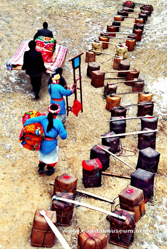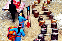 从提亲到完婚,需历经一连串古老、原始新奇而怪诞的繁缛礼仪。最是撩人心扉、揪撼肺腑的,当数婚俗活动中的“打泥巴”、“炒茅李壳”和“顿屁股”这圣洁而疯狂的三步曲,气氛热烈、火爆而粗犷。从各个寨子赶来的人们,几碗米酒下肚,抛却了往常的一切羞躁、沉稳、压抑和劳顿,火撩火烧地唱啊、跳啊、喊呀、叫呀、哭哟、笑哟……