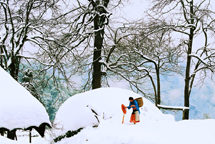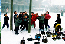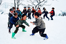 天真的孩子们在雪地里打滚、追逐、摔跤、抢篮球、踩高跷、溜滑板,或拉成一串玩那老鹰抓小鸡,男男女女追逐着打一场雪战,冷不防姑娘们还会找准个顽劣刁蛮的汉子疯狂的扑过去,啪地一声将地掀翻在地,再使劲的往他的嘴里、衣领里、裤裆里塞雪团,忽又撩的撩脚、拖的拖手,硬把他给仰面八叉地抬了起来,窜呀、抛呀,喊哟、叫哟,掌声阵阵、笑声串串。