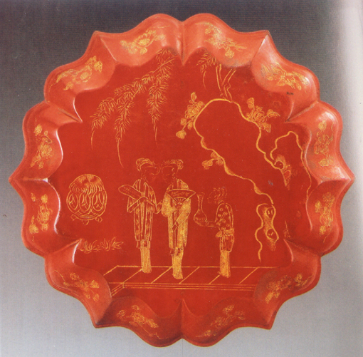 南宋朱漆戗金莲瓣式人物花卉纹奁(盖面)