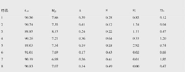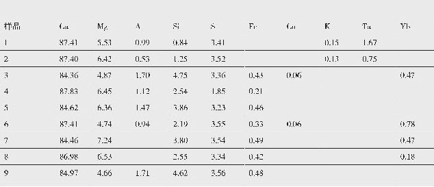 表 2 为风化面元素成分及含量表。从表 2 可以看出,无灰尘的风化面都含有钙、镁、硫,还含有微量的铝、硅、钾、铊等,而有灰尘的风化面主要含有钙、镁、硅、硫,还含有微量的铝、铁、铜、镱等金属。表 3 为基体面元素成分及含量表,从表 3 可以看出,石碑基体主要成分为钙、镁,含有微量的硅、铝、硫和镱等其他金属,铝和硫的含量都在 1% 以下。由于荧光分析显微镜只能检测到原子序数 10 以上的元素,所以石材中的碳、氧无法反映出来,但原子序数在10 以上的元素其含量的比例较为准确。