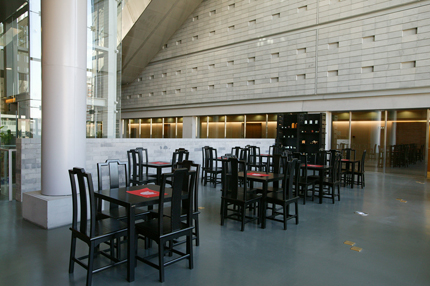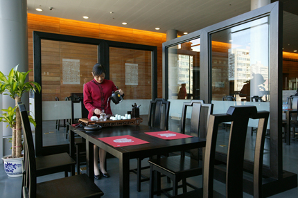 西窗烛茶室位于馆内西侧方形展馆二层平台,百余平米。西靠主体玻璃幕墙,东望竹林庭院。茶室设计简约,融合中西风格,是休闲品茗的好地方。