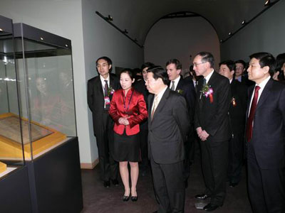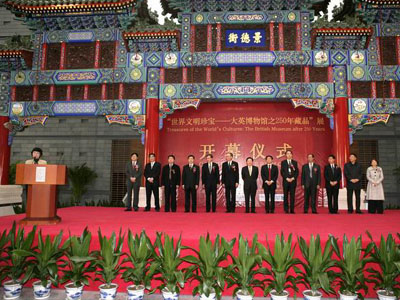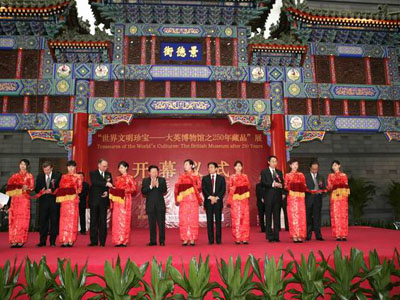 首都博物馆与英国大英博物馆联合举办的“世界文明珍宝——大英博物馆之250年藏品”展于3月18日正式开幕。文化部部长孙家正、英国驻华大使威廉·厄尔曼、北京市市委宣传部部长蔡赴朝、北京市文物局局长梅宁华等领导和嘉宾出席了此次展览的开幕式,同时为展览剪彩,并兴致勃勃的参观了展览。