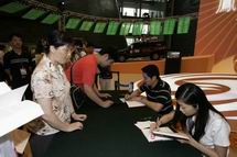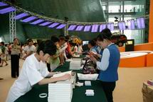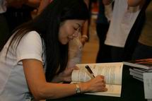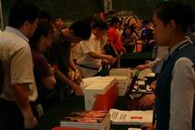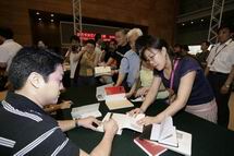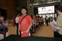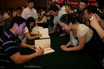 热心观众排起了长队 凤凰卫视主持人曾子墨、董嘉耀 在首博大厅现场签名售书
