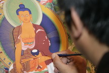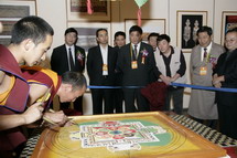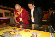 图片。在所有的参展文物中,观众最熟悉的应该是西藏的唐卡了,在展厅中央,一幅高5米多、宽3米多的巨型唐卡成为这次展览的亮点。主办方为方便观众直观地了解西藏文化,还特地从西藏请来僧人和艺术师进行现场艺术品制作演示。西藏民间文艺家协会理事、唐卡画师次旦朗杰在展厅的一角一边绘制唐卡,一边向观众介绍着唐卡的做法。参观者还会在展览的前6天看到“坛城”的制作过程。在展览现场,会有8名僧人耗时8天用彩沙铺画成一幅一米见方的“坛城”,按照惯例,在展览结束后,这个美轮美奂的艺术品将被抹去。这种宗教艺术同时将创造和消亡融入其中,极具震撼力。此外,展品中还有两件十四世达赖喇嘛在1954年到北京出席第一届全国人民代表大会时,敬献给毛泽东主席的礼品,一件为珍珠挂带,一件为千辐金轮。