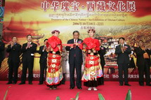 今天下午,由中国西藏文化保护与发展协会主办的《中华瑰宝·西藏文化展》在首都博物馆隆重开幕了。中央统战部副部长、中国西藏文化保护与发展协会副会长朱维群致开幕辞,全国人大常委会副委员长、中国西藏文化保护与发展协会名誉会长热地为开幕式剪彩,中国藏语系高级佛学院院长嘉木样主持开幕式,出席开幕式的领导、嘉宾还有:中国藏学研究中心总干事拉巴平措,国家文物局局长单霁翔,中国藏学研究中心副总干事、书记朱晓明,中国佛教协会西藏分会会长珠康活佛等。