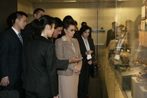 郭小凌馆长在门前迎接总统夫人,并陪同参观。总统夫人仔细参观了《古都北京·历史文化篇》、《古代瓷器艺术精品展》、和《京城旧事·老北京民俗展》等展览,并饶有兴趣地观赏了多幕立体影片《古都神韵》和高清晰数字电影《辉煌的北京》。