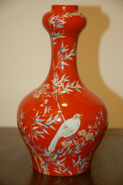 7、珊瑚红地珐琅彩花鸟纹瓶