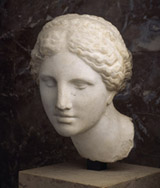 该头像是《克尼杜斯的阿芙罗狄忒》最好的复制品,原作出自古代最著名的雕塑家普拉克西特利斯之手,现已遗失。这尊塑像让欣赏到普拉克西特利斯的独特风格:人物的脖子修长,脸庞清癯,嘴小,额头几乎完美地被几绺头发勾勒出了一个三角形,头发中分,用两根平行的发带束住。但是最重要的特征是眼睛的技法:下眼皮很深,眼眉从眼角处开始形成了完美的弓形,使女神的眼神显得深邃而神秘。这张古典面庞确立了希腊美的典范,并由罗马人传播到整个西方艺术之中。