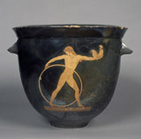 这种双耳爵是在会饮中用于混合酒和水的,其比例协调,爵的身高和直径相等,爵脚的直径与杯口的直径相等。画家经常在这种红绘双耳爵一个侧面只描绘一个人物形象。