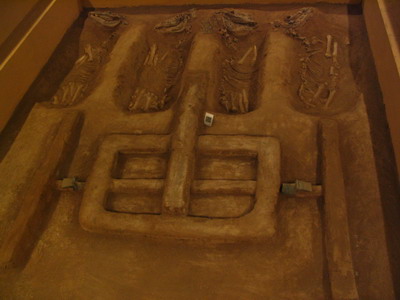 另一墓室里陪葬的四匹马和车。陪葬的动物中似乎马最多。有时是随陪葬的车一起,有的是墓主生前骑过的。