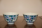 说明: 斗彩葡萄纹杯(一对), 斗彩是釉下青花和釉上彩相结合的彩瓷工艺,釉下青花与釉上诸彩相互斗妍媲美,故称「斗彩」。