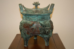 说明: 此鬲自盖钮至足,通体装饰着七个牛角飞扬的牛首兽面纹。盖内及颈内壁铸有铭文「在戊辰,燕侯赐伯矩贝,用作父戊彝」。记载了贵族「伯矩」为纪念燕侯赏赐贝币而铸此鬲。