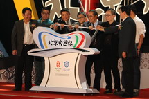 出席发布仪式的领导和歌曲的创作团队共同拉下手杆,发布仪式启动