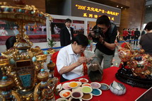 全国人大副委员长陈至立饶有兴致的体验景泰蓝的制作