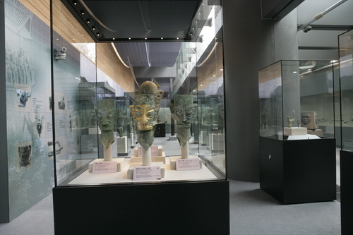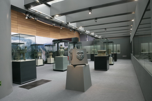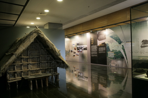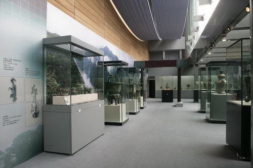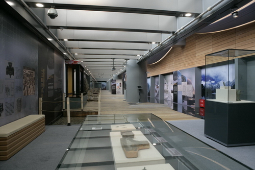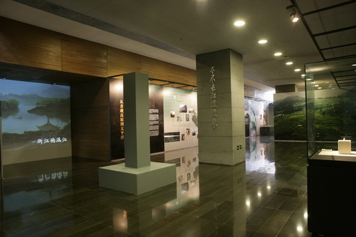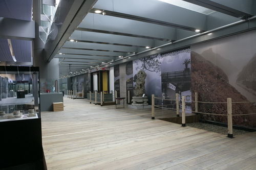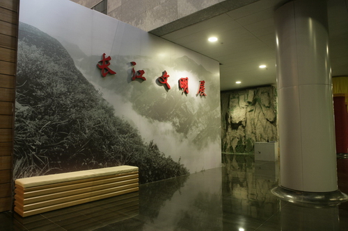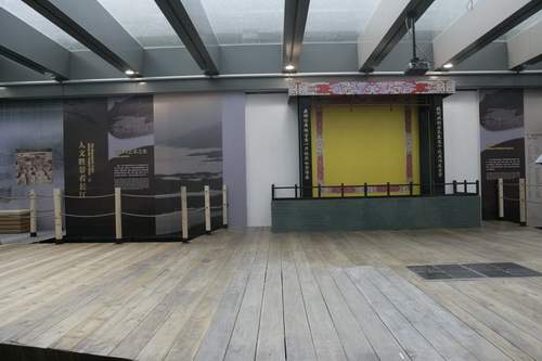 “长江文明展”充分利用首博新改进的水景庭院展厅,展厅地面模仿码头与船舰形式,与草棚、民居融为一体。