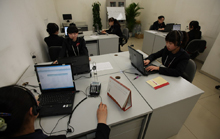工作人员紧张忙碌,为通过电话进行预约的观众登记信息