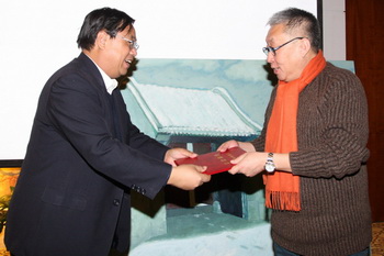 首都博物馆副馆长王武钰先生向钟鸣先生颁发《首都博物馆捐赠证书》