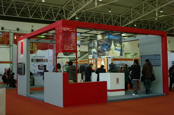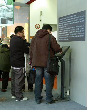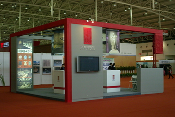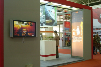 首都博物馆“馆标”装饰,并以红色梁架搭起的立方体首都博物馆展区显得格外抢眼。展墙的外立面悬挂等离子电视,其上滚动播放首都博物馆宣传片,及各个展厅过往、当下的展览介绍片。展区内,观众抬头便可看由首都博物馆展厅和展览海报拼合制作的灯箱。我们将博物馆展厅内的电子触摸屏,开放区的电子互动设备搬到了本次展区内,观众可以通过使用这些设备,点击相应栏目,了解首博展览概况,欣赏文物精品。此外,我们还将博物馆内的电子互动游戏项目引入本次次展会,比如2008年北京奥运会期间,首博推出了迎接奥运盛会的五大特展,博物馆博资料信息研究中心为配合五大特展之一的《公平的竞争——古希腊竞技精神展》而专门制作了“希腊竞技拼图游戏”电子互动项目,即使该展览已经谢幕,但观众仍然可以通过参观首博展区参与这个游戏。