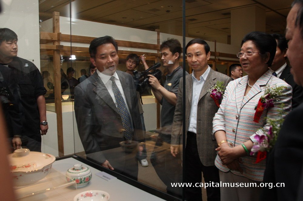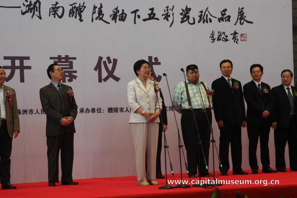 出席开幕仪式的嘉宾有原全国人大常委会副委员长顾秀莲女士、国家工商总局周伯华局长、原国土资源部孙文盛部长、原中纪委副书记、国家文化部夏赞忠副部长、中国人民解放军军事科学院战争理论和战略研究部毛新宇副部长、湖南省株洲市委陈君文书记、湖南省株洲市王群市长、原国家环保总局祝光耀副局长、全国工商联副主席、新华联集团总裁傅军先生、中国人民革命军事博物馆研究员、著名书法家李铎先生、湖南省文化厅孟庆善副厅长、北京市文物局崔国民副局长、首都博物馆郭小凌馆长、中国古陶瓷协会王莉英副会长,首都博物馆姚安副馆长主持了开幕仪式。顾秀莲副委员长、周伯华局长、陈君文书记、崔国民副局长、郭小凌馆长、王莉英副会长分别为展览开幕致辞。开幕式结束后,到场来宾一同参观了展览。