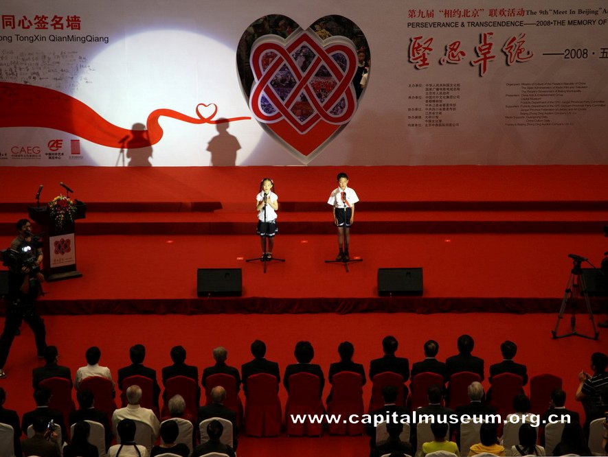 开幕式中,全体与会嘉宾及观众默哀一分钟,以此悼念亡灵寄托哀思。来自北京市东城区少年宫的小朋友们童声诗朗诵《妈妈别哭我去了天堂》,北京市西城区少年宫的小朋友们童声合唱《让爱传出去》,稚嫩的声音回荡首都博物馆礼仪大厅会场,将气氛推向高潮。有关领导为开幕式致词。之后,中央领导与来自汶川灾区儿童代表走上主席台,触摸背景墙上的同心结,点亮“五月记忆”爱心之灯,为展览揭开大幕。