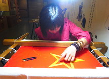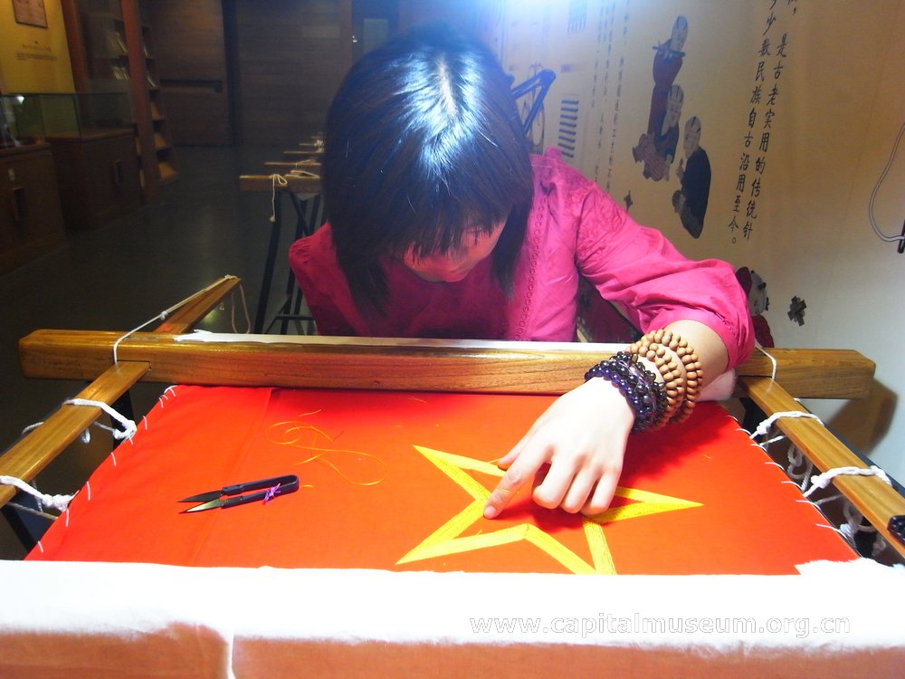 绣艺坊于2009年的“六?一”开办以来,各种主题活动的推出,使得更多的观众有机会亲身体验中国传统刺绣工艺,一试身手。这次“我爱我的祖国——亲手绣国旗”主题活动让贴切国庆主题,又不由得让我们想起一个熟悉的场景:建国前夕,歌乐山渣滓洞的革命先烈为了庆祝伟大祖国的成立以绣红旗的方式献上对祖国母亲的祝福。