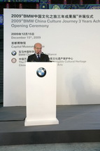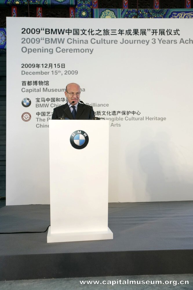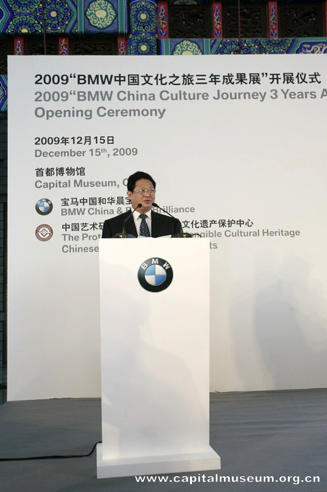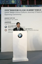 2009年12月15日上午,由宝马中国和华晨宝马携手中国艺术研究院·中国非物质文化遗产保护中心共同举办的“BMW中国文化之旅”三年成果展在首都博物馆开幕。中国艺术研究院副院长、中国非物质文化遗产保护中心常务副主任张庆善先生,宝马(中国)汽车贸易有限公司总裁史凯先生,文化遗产保护方面的专家,爱心车主以及媒体共襄盛举,一同出席了成果展的开幕仪式。