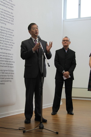 三人的发言博得热烈的掌声。开幕式后宾主观看了展览。郭小凌馆长还接受了瑞典电视台的采访,对首博推出的文物的价值与展览的意义做了说明。