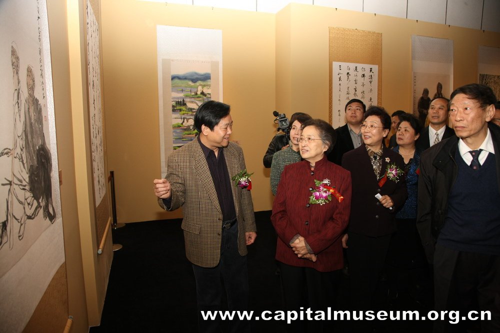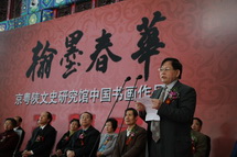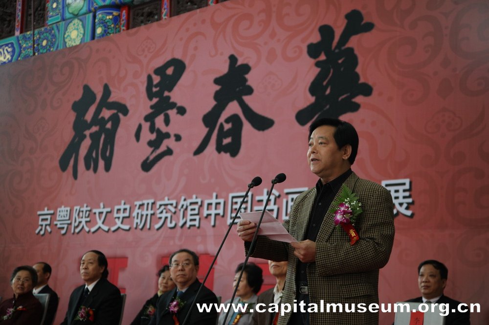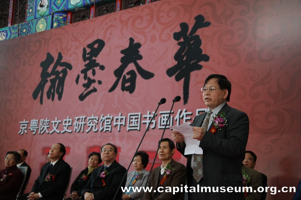 2010年4月13日上午,由北京市文史研究馆、广东省人民政府文史研究馆、陕西省文史研究馆共同主办的“翰墨春华——京粤陕文史研究馆中国书画作品展”在首都博物馆举行了隆重的开幕仪式。全国人大常委会原副委员长何鲁丽,北京市委常委、统战部部长牛有成,北京市人大常委会副主任刘晓晨,北京市副市长程红,北京市政协副主席陈平,国务院参事室原副主任、中央文史研究馆原副馆长王楚光,北京市委副秘书长肖培,中国美术家协会原副主席、中国美术馆原馆长杨力舟,中国书法家协会副主席、北京书法家协会主席林岫,北京市文物局局长孔繁峙,北京市友协常务副会长李晓强,北京市委办公厅副主任吴大仓出席了开幕仪式。出席开幕式的还有陕西省、广东省有关方面的领导及北京、广东、陕西三省市文史研究馆馆员、首都书画家等。