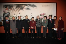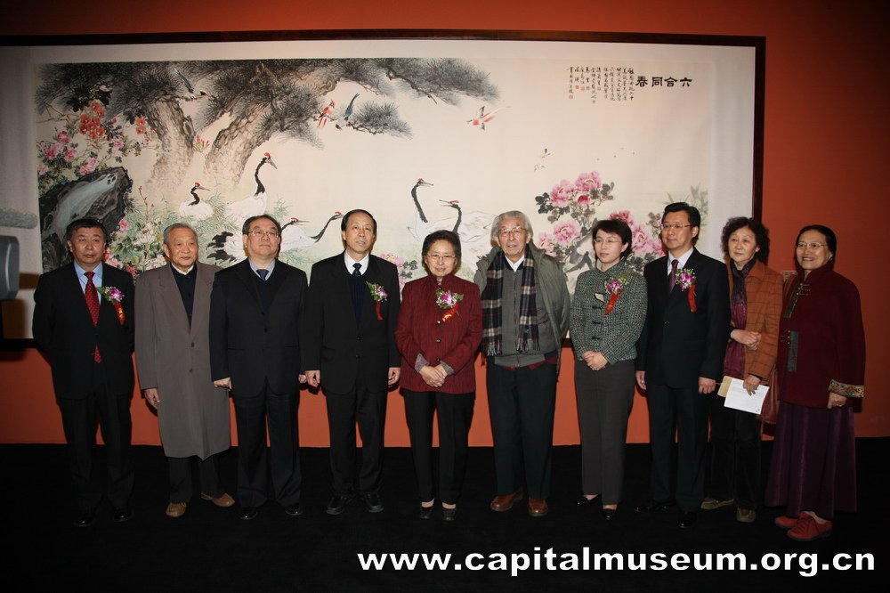 嘉宾们在北京市文史研究馆六位馆员集体创作作品《六合同春》前合影留念 |