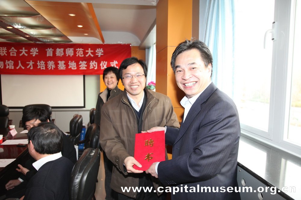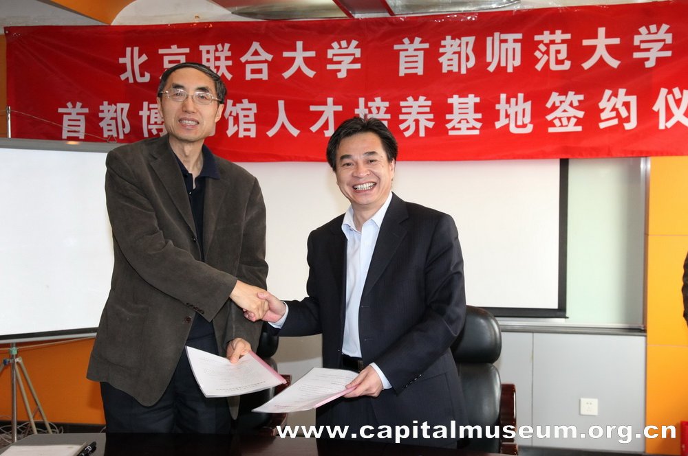 为不断适应国家和首都经济建设与社会发展对高等学校创新人才培养的要求,进一步加强北京高等学校的实践教学,培养大学生实践能力、创新能力和创业能力,首都博物馆与北京联合大学、首都师范大学联合向北京市教委申报建立市级校外人才培养基地,三方合作协议于2010年4月14日在北京联合大学应用文理学院正式签署。