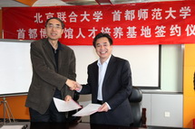 首都博物馆馆长郭小凌(左)与北京联合大学校长柳贡慧(右)签署协议 |