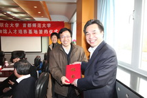 北京联合大学校长柳贡慧(右)向首博专家颁发聘书 |
