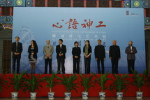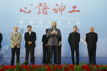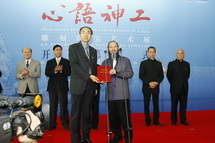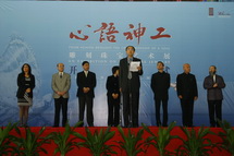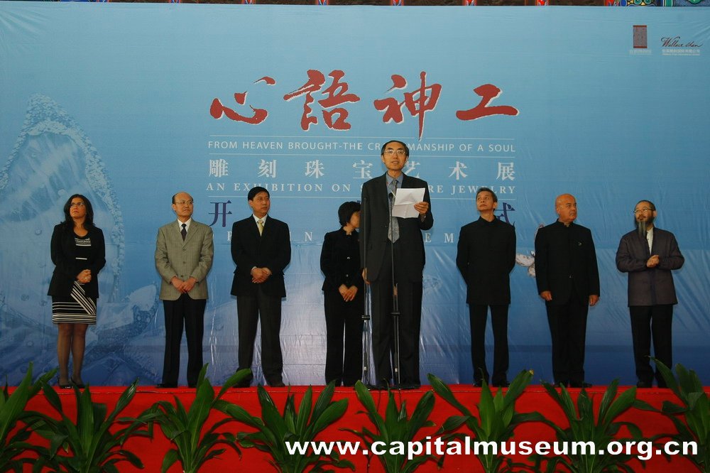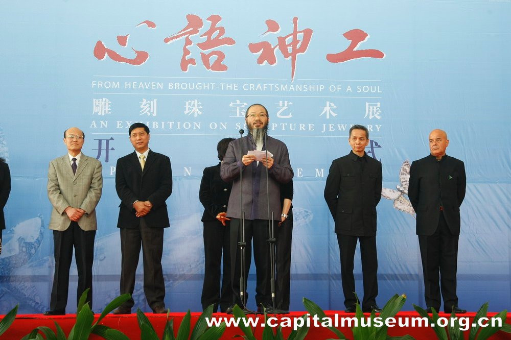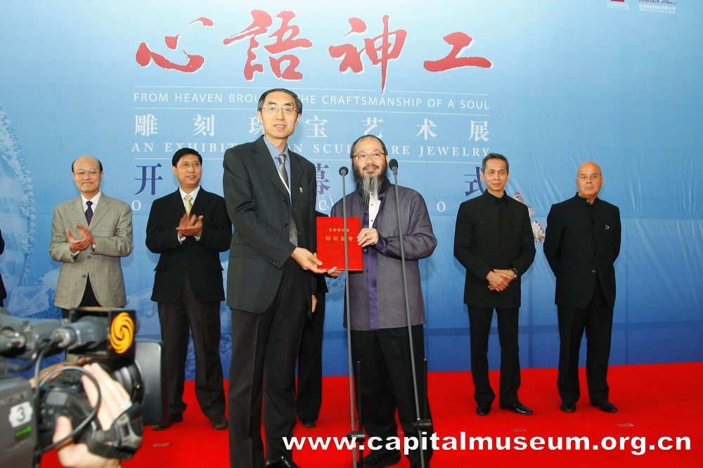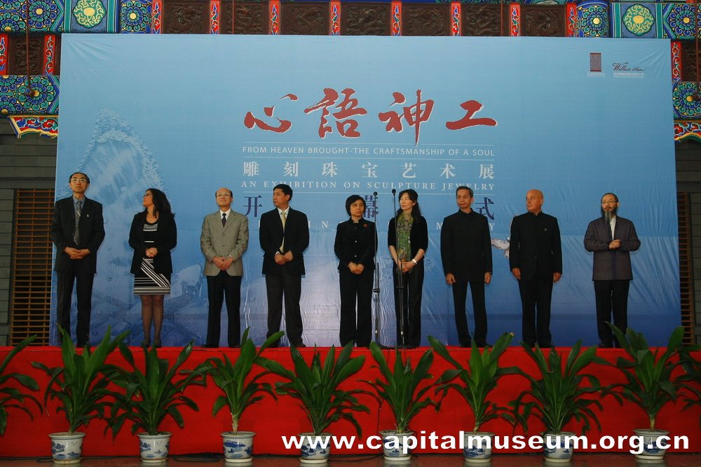 2010年4月28日下午,在首都博物馆礼仪大堂召开了展览开幕仪式。北京市文物局于平副局长,国家大剧院杨玲副院长,国检珠宝培训中心杨立信主任,上海当代艺术博物馆(MOCA)龚明光馆长,北京工艺美术学会郭鸣理事长,瑞士珠宝协会会长让-弗朗索瓦·米绍先生,美国纽约著名珠宝艺术家玛丽·费舍尔女士,欧洲著名艺术评论家安德鲁·科恩先生,首都博物馆郭小凌馆长,“心语神工——雕刻珠宝艺术展”主创人、国际珠宝设计大师陈世英先生出席了开幕仪式并为展览剪彩。开幕仪式由首都博物馆姚安副馆长主持。在开幕仪式上,陈世英先生向首都博物馆赠送了一件名为“见龙在禅”的作品并做了精彩的讲解,这件以蝉为素材的作品是由红碧茜、钻石、黄宝、蛋白石、水晶、青金、贝母、钛、黑曜石、黄金等多种材料加工而成,集合了雕刻底蕴、特别冶炼的钛金属塑形工艺,和浓厚梦幻感的钻石彩绘,乃雕刻珠宝颠峰之作。蝉的翅膀以贝母为底,嵌千足金鱼鸟,再盖上雕有游纹的水芯片,1500多颗各类钻石和黄宝满布蝉身。随后,首都博物馆郭小凌馆长代表首都博物馆向陈世英先生颁发了《首都博物馆收藏证书》。