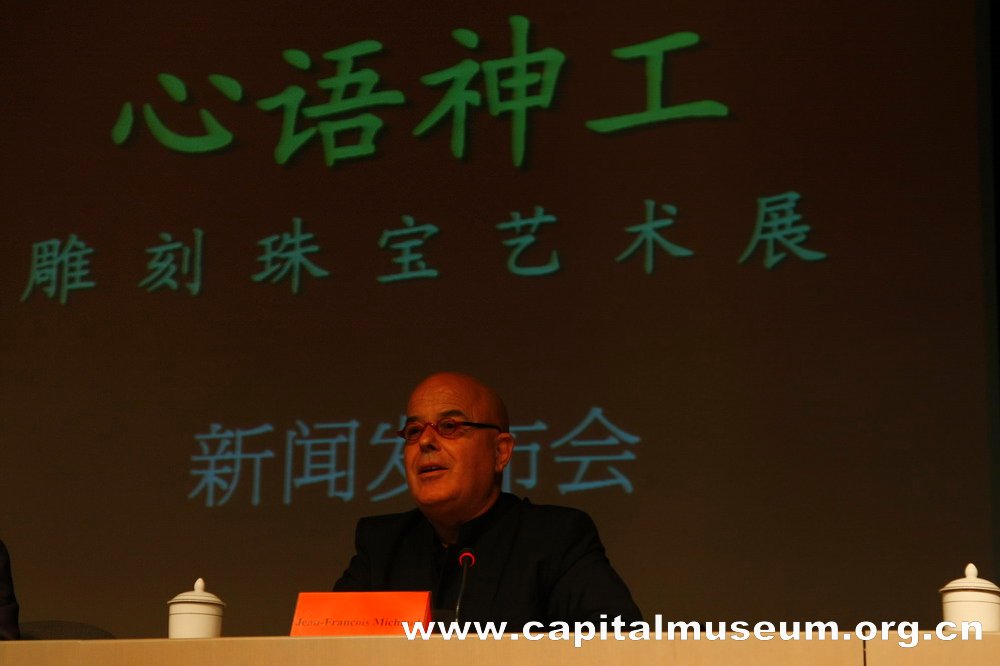 在开幕仪式之前,还召开了展览的新闻发布会,首都博物馆姚安副馆长、国际珠宝设计大师陈世英先生、瑞士珠宝协会会长让-弗朗索瓦·米绍先生先生出席了发布会。发布会上,姚安副馆长、陈世英先生分别介绍了展览的整体情况和展品的具体情况。姚安副馆长表示,此次展览是首都博物馆的“首次创新展览”,它打破了首博以往以考古、文物展为主的办展模式,是一次大胆的尝试。首博希望通过此次展览,能够开创一种新的展览思路,在向社会公众展示中国古代艺术无穷魅力的同时也将当代的优秀艺术作品展示给大家。