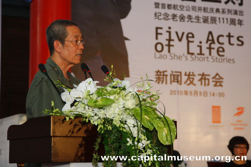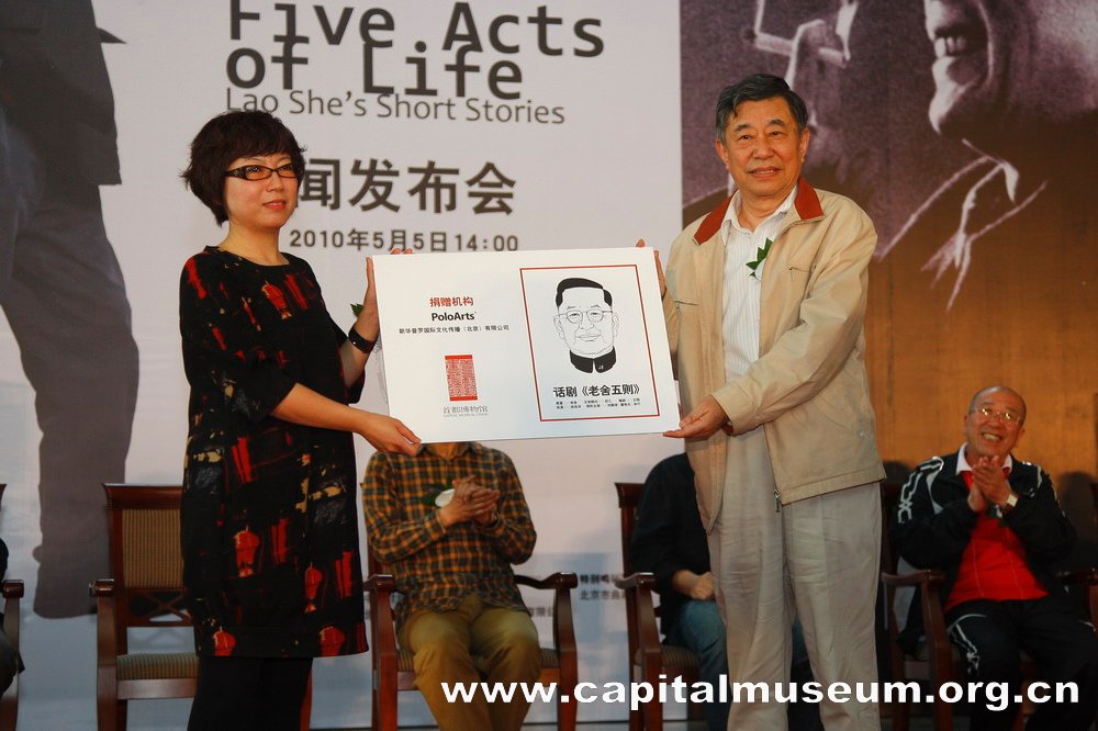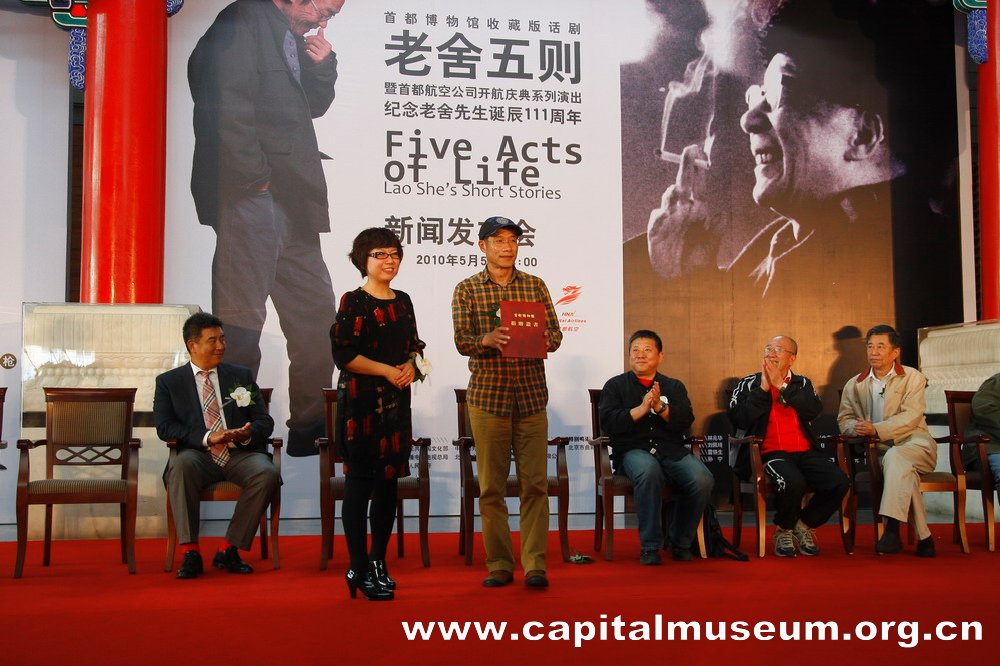 2010年5月5日,在首都博物馆召开了首都博物馆收藏版话剧《老舍五则》北京首演暨首都航空启航庆典系列演出新闻发布会。首都博物馆副馆长姚安,海航旅业集团总裁马国华,海航旅业集团副总裁、首都航空筹备负责人胡明波,新华普罗国际文化传播(北京)有限公司王翔,《老舍五则》文学顾问舒乙,《老舍五则》导演林兆华,《老舍五则》主演雷恪生、刘佩琦,京味儿作家刘一达,北京市曲剧团书记孙东兴出席了新闻发布会。