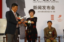 姚安副馆长向《老舍五则》剧组代表刘佩琦颁发话剧《老舍五则》收藏证书 |