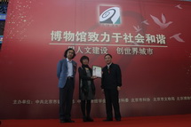 中共北京市委宣传部副部长张淼、北京清尚建筑装饰工程有限公司总经理吴晞为获奖单位代表首博副馆长姚安颁奖 |