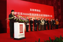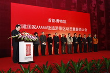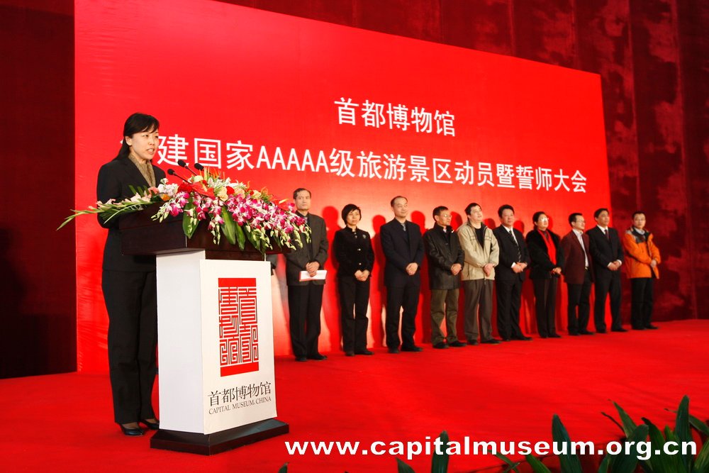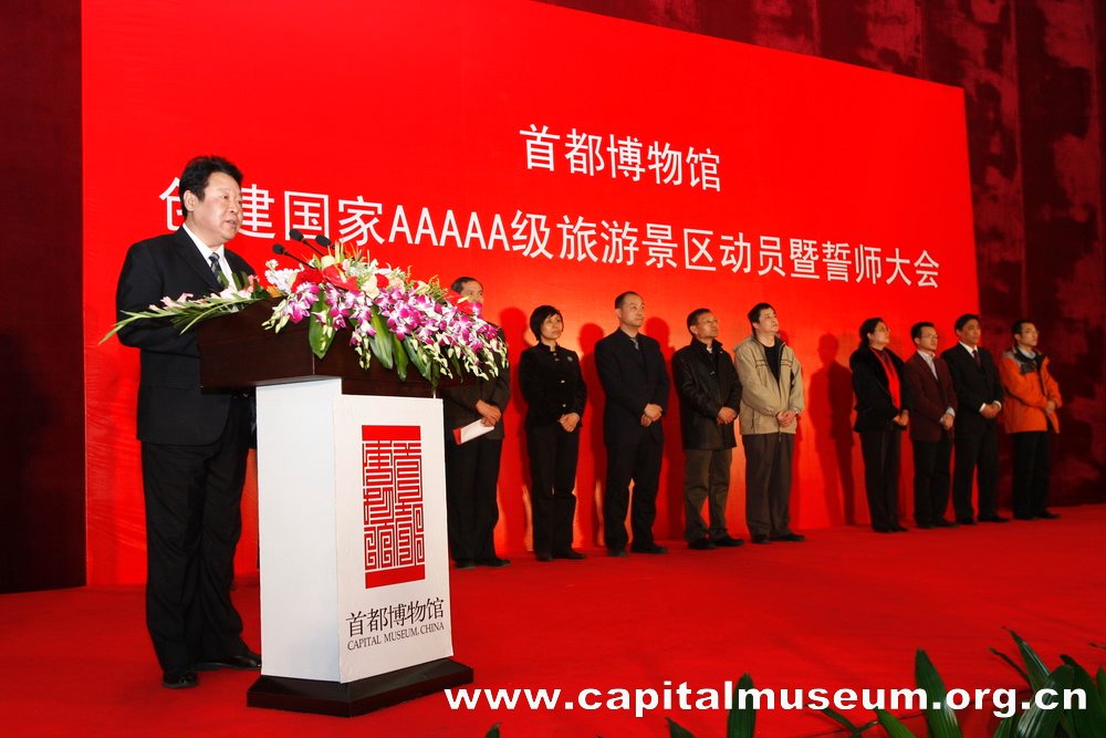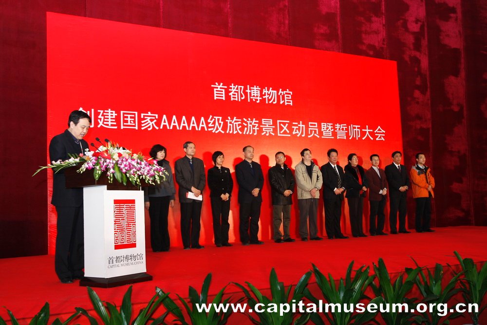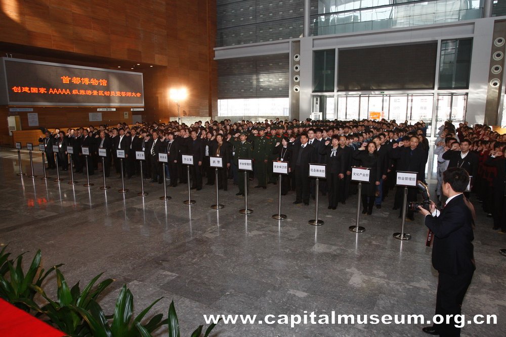 2010年11月15日上午10时,“首都博物馆创建国家5A级旅游景区动员暨誓师大会”在首都博物馆礼仪大厅隆重召开。出席本次大会的有国家文物局、国家旅游局、北京市委宣传部、北京市文物局、北京市旅游局、西城区旅游局的相关领导。旅游景区的各位专家、首都博物馆全体员工、驻馆武警以及新闻媒体的记者等近千人参加了大会。会议由首都博物馆副馆长安理主持。