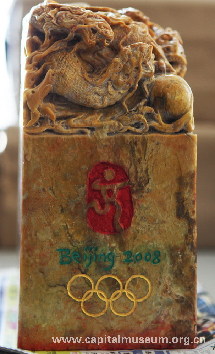 此件印章为北京奥运会召开而作。雕龙纹钮,朱文刻篆文“和谐奥运”四字。 玺印侧面刻有北京奥运会徽和五环标志。郑久康先生2009年捐赠。 |