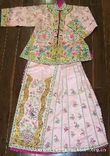 捐赠者1920年来中国6个月并在北京结婚,丈夫当时在印度的公司工作。此衣服正是她结婚时所穿的服装。粉缎底配金线平绣花,工艺精美。 Mrs.C.Vass-Rudnai(瑞士籍)2005年捐赠。 |