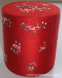 民国时期保温壶所用红缎面壶套,上绣有花卉图样。孟婧荣女士2006年捐赠。 |