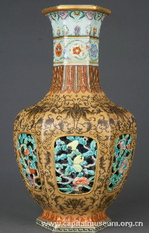 乾隆八年,督陶官唐英和其助手共同研制成夹层玲珑瓶九种,呈献给乾隆皇帝,套瓶就是其中的一种 。这件套瓶内为青花瓶,外为粉彩,腹部雕刻六组镂空花果纹。成型工艺非常繁复,需多次上釉多次入窑烧制而成,烧制成功极为不易。乾隆粉彩繁缛华丽,工艺精致。北京市文物公司2006年捐赠。 |